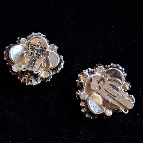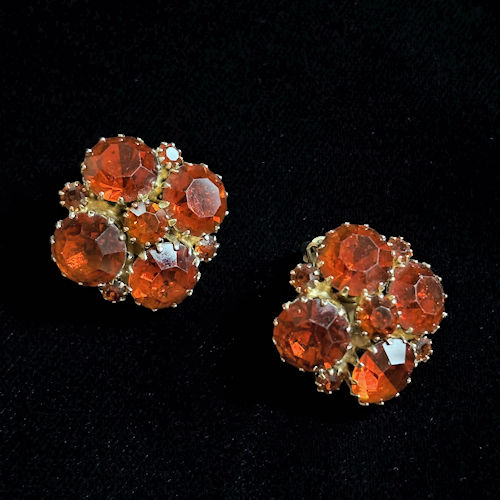 華やかなガラスがキラキラと輝くイヤリングです。オレンジがかったアンバーカラーのガラス、少しくすんだ深い色合いながら輝きは深く華やかです。WEISSというアメリカのコスチュームジュエリーブランドのもの。存在感のあるイヤリングです。よく見るとガラスの中に箔の剥がれと思われる黒い点々が見られますが目立つものではございません。ヴィンテージにご理解ください。