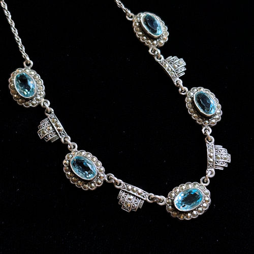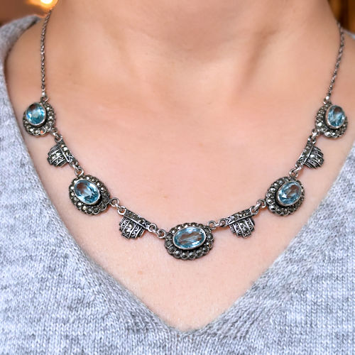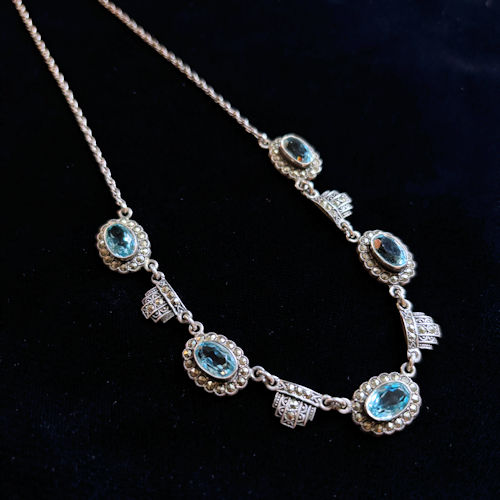 | 爽やかに輝くブルーペーストとマーカサイトのネックレスです。アクアマリンやブルージルコンのような薄い水色、光を浴びるときらきらと美しく輝きます。マーカサイトはアールデコの雰囲気のあるモチーフにはめ込まれています。たいへん深く美しく輝く粒が使われています。シルバーがたっぷりと裏側まで使われ、しっかりとした作りです。チェーン部分はねじりを持たせた美しいチェーン。きれいに首筋に沿うサイズ、肌に直接でも、冬にタートルネックにでも合わせていただけると思います。イギリス純銀製の刻印、獅子や錨の刻印などたくさん入っています。経年による少々の黒ずみなど見られますが、程度は良好です。1900年代前半の美しい作りのペンダント、最近では稀少になってきた逸品です。 |