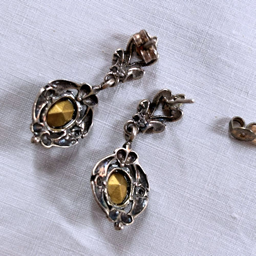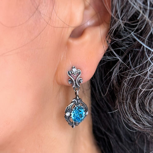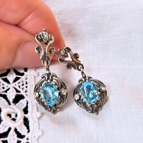 瑞々しく輝くブルーガラスが揺れるピアスです。曲線的なシルバーカーヴィングが優雅なデザイン、ところどころにホワイトガラスもきらめきます。アンティークらしい雰囲気のロングタイプ、動くたびに耳元で揺れる爽やかな印象のピアスです。経年によるシルバーの黒ずみが少々見られます。古いものにご理解ください。