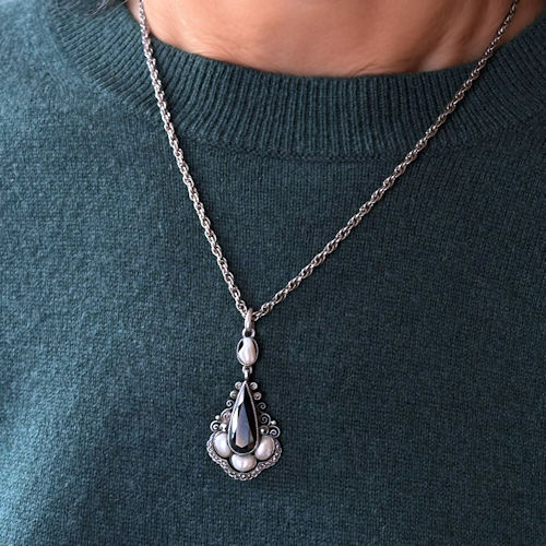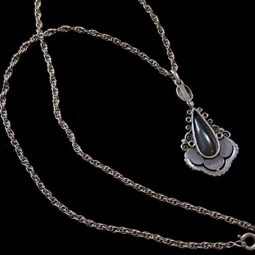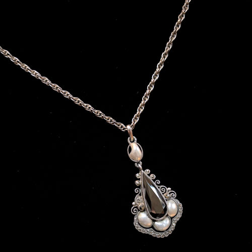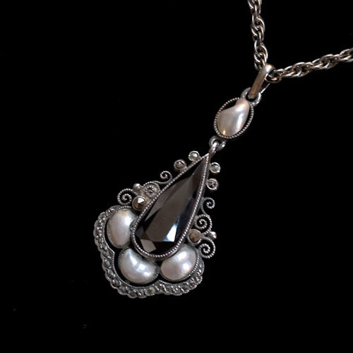 雫型にカットされたヘマタイト、それを囲むように配された銀線細工(フィリグリー)の美しいペンダントです。ヘマタイトは黒くメタリックな輝きが魅力の鉄鉱石。少しグレーがかったバロックパールがよく合います。縁にはマーカサイトもちりばめられきらきらと輝き華やかな印象です。 ドイツのジュエリー作家、テオドア・ファーナー作、アールヌーヴォーからデコを感じさせる美しいデザインと作りです。ファーナー作の印、TFとシルバー935の刻印が入っています。