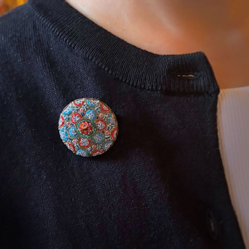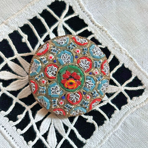 3cmほどの中に細かなガラス片がぎっしりと敷き詰められたマイクロモザイクのブローチです。中央には花のモチーフ、オレンジとターコイズブルーが全体を引き締めます。マルチカラーですがくすんだ色味で落ち着いた大人っぽい印象です。 小さくつけやすいサイズではありますが存在感がありますので装いのアクセントになりそうなブローチです。ほんの小さなカケはありますが目立つものではなくアンティークモザイクとしては程度は良好です。古いものにご理解ください。