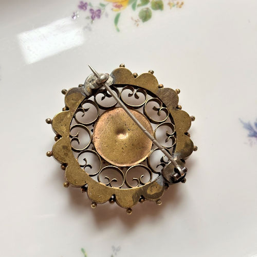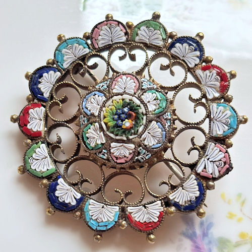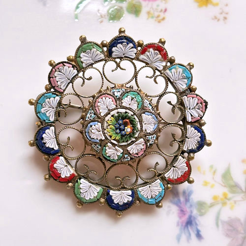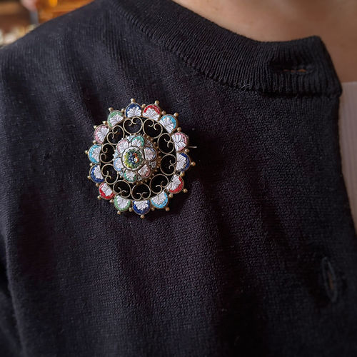 | 細かなガラス片を敷き詰めたローマンモザイクのブローチです。コスチュームブローチのように透かしも施された台にマイクロモザイクが円形に敷き詰められています。ピンク、ブルー、レッド、グリーンなどマルチカラーではありますがそれぞれがくすみカラーですので全体的にアンティークらしい落ち着いた印象です。程良いサイズ感で合わせる服の色も選びませんのでつけやすいと思います。また丸形はどの角度でもつけられますので歪みを気にせず、ブローチをつけ慣れない方にもおすすめいたします。ほんの小さなカケなどはありますが目立つものではなく、アンティークモザイクとしては比較的程度は良好です。 |