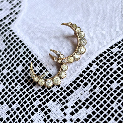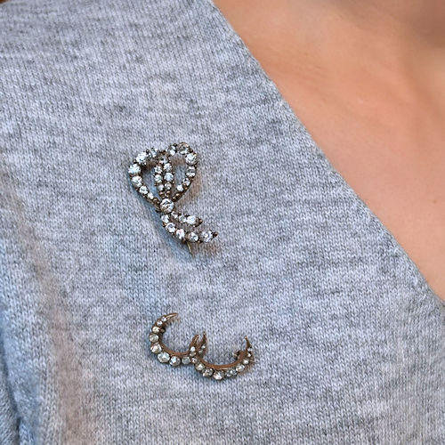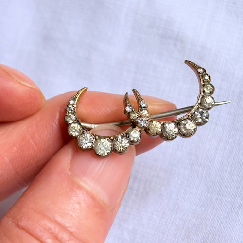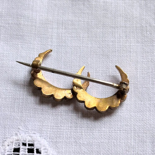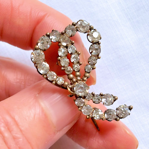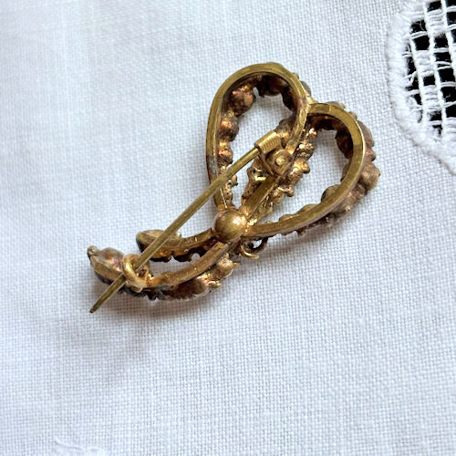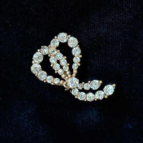 | ダイヤモンドの代替品として珍重されたペーストガラス。深い独特の輝きが魅力です。こちらはリボンをひねったようなデザイン、甘くなく大人っぽくつけていただけるデザインと思います。合わせる服の色も選ばず、大きさも程よく、つけやすいブローチです。重ね付けにも。金具は引っ掛けるだけのシンプルなもの、金具との間が少し空いていますので厚地のものにつけていただく方が収まりがよいと思います。金属のくすみなど経年感はございます。古いものにご理解ください。 |