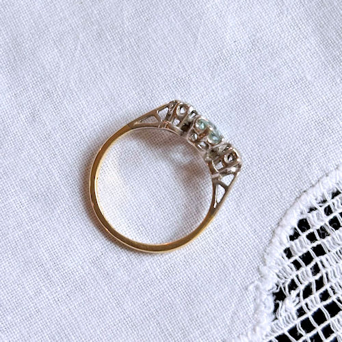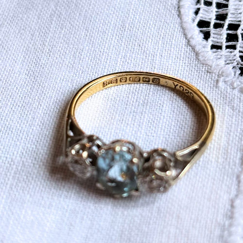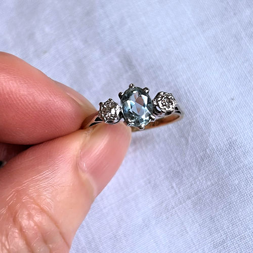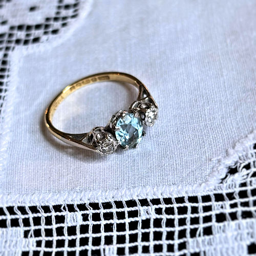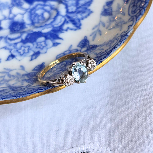 | 淡いブルーが爽やかなアクアマリンとダイヤモンドのリングです。 オーバルの大粒アクアマリン、透明感のある涼し気な輝きが魅力です。サイドのダイヤモンドはシルバーの台座にはめ込まれています。横から見ると王冠のようなセッティングになっており、アンティークらしい丁寧な美しい作りです。石のセッティング部分のみシルバーで指周りなどは18金、刻印もたくさん入っています。飽きの来ないシンプルなデザインですので長く愛用していただけそう。カジュアルに日常使いにもしていただきたい上質感あるリングです。 |