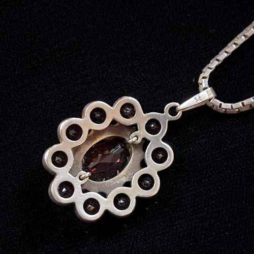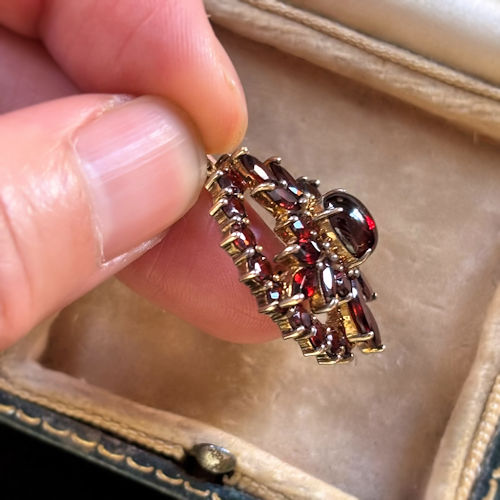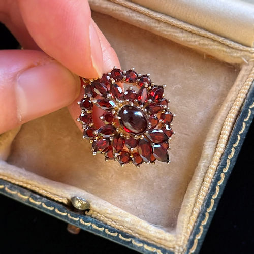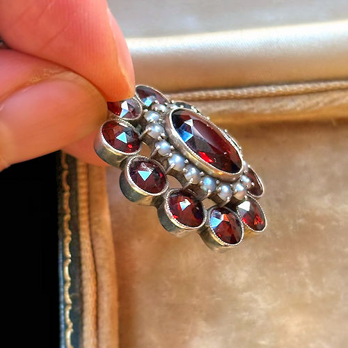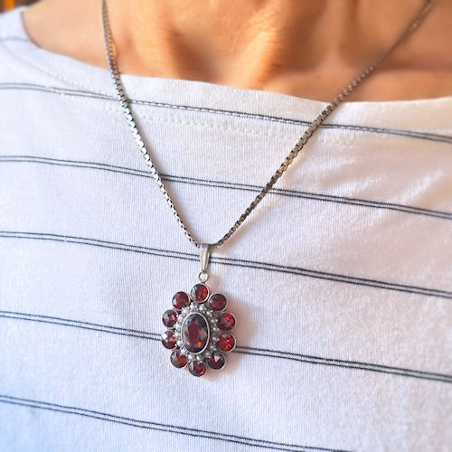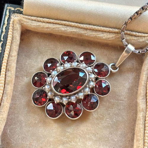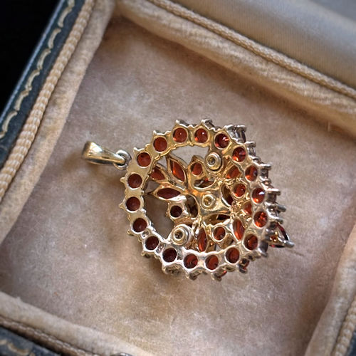 大ぶりで華やかなガーネットのペンダントトップです。赤く深く輝く大粒ガーネットがオーバルの花のように配され、たいへん華やかに輝きます。中央石との間にシードパルが細やかに敷き詰められ上品さを添えます。存在感のあるサイズ、シンプルな服装が華やかな装いに格上げされそうなペンダントです。1920年代製。