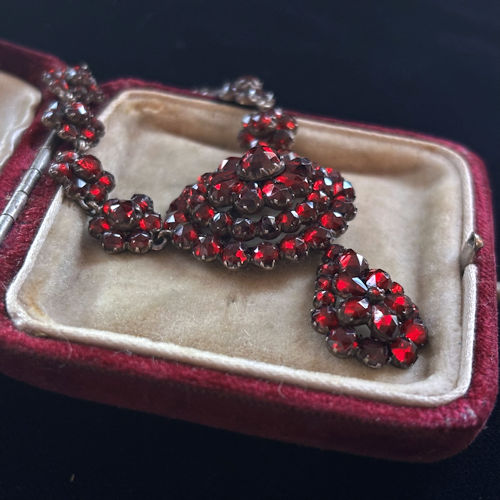 | ガーネットをふんだんに使ったネックレスです。首周りぐるりがすべて花モチーフガーネットになっているたいへん贅沢な作り。トップ部分は立体的に配されたオーバルから下がった雫型モチーフが揺れるデザインになっています。ヴィクトリア時代のガーネットは黒みがかった赤、華やかすぎずたいへんシックで上質感ある輝きです。首に美しく沿う長さ、シンプルなワンピースやトップスと合わせて華やかなお席でもつけていただけそうです。ローカラットゴールド台で裏側がしっかりと留めつけらられています。何世代にも渡って宝物にしていただける、アンティークの真髄とも言える逸品です。 |