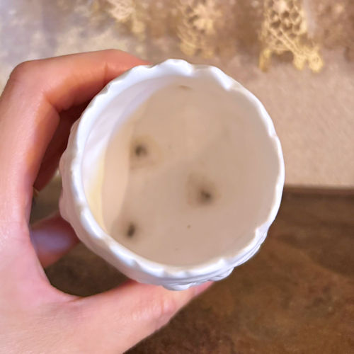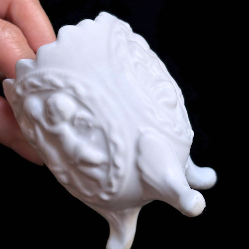 天使のモチーフ、教会で使われていたものでしょうか、足付の陶器です。卵型のボウルに3か所天使のモチーフが浮き上がったデザイン。マットな白磁の中にぼんやり天使が浮き上がる雰囲気の良いお品です。小さいものながら存在感がございます。フランスパリで購入いたしました。傷みなど特に見当たりませんが古いものにご理解ください。