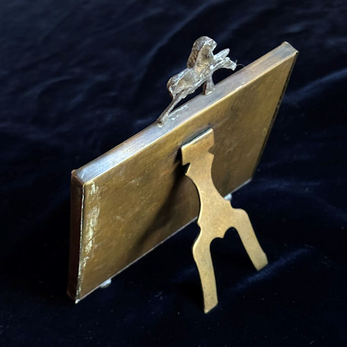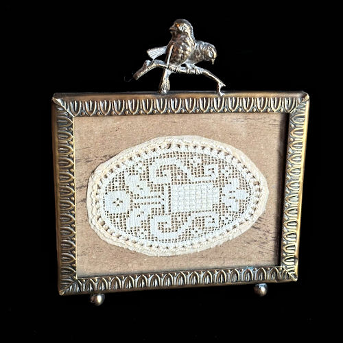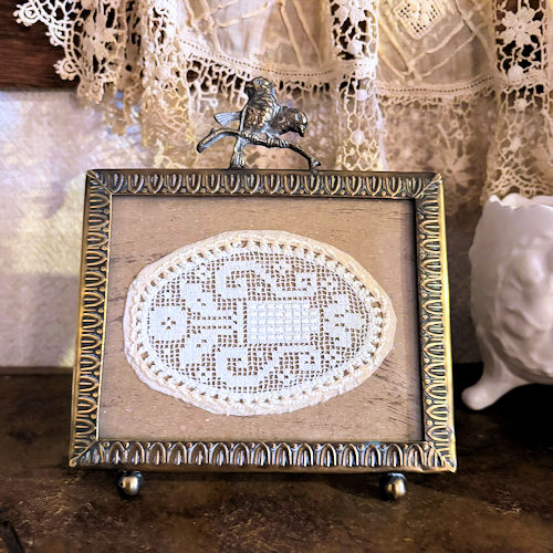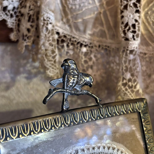 | 小さめの真鍮製フレーム、上には2羽の鳥が枝に止まるモチーフが配されています。全体的に刻みの入ったフレームはシンプルながら手の込んだデザイン、丸い足もアクセントになっています。今中にはレースモチーフが入っていますが、替えることは可能です。ポストカードを入れたり写真を入れて飾っていただけます。真鍮の色が古色あるくすんだ光でとても良い雰囲気のフォトフレームです。 |