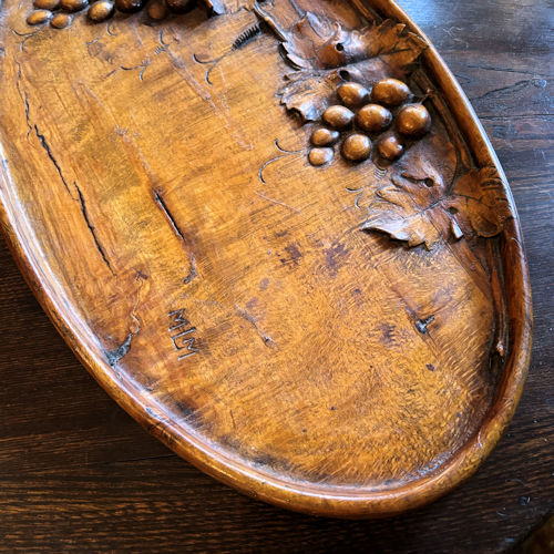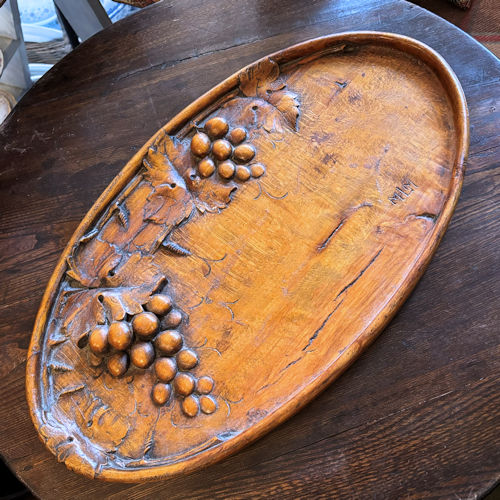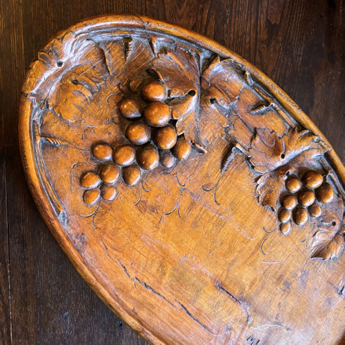 | 葡萄が立体的に彫り上げられたウッドカーヴィンぐボードです。たいへん良い木味と色味の木にもこもことした葡萄が大胆な構図で表現されています。葉も実も蔓も美しい彫りです。トレイとして使えなくもないですが、どちらかというとインテリアとして飾っていただくのが良いかと思います。フラットな部分に字を書いて、お店の看板やサインなどにもお使いいただけます。お写真のように亀裂や表面の凹凸もございますがアンティークな雰囲気はたっぷりです。古いものにご理解ください。 |