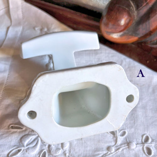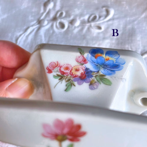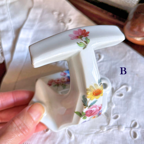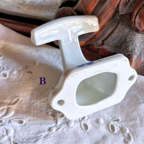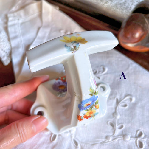 フランスで購入した陶製フックです。白地に様々な色の花々がプリントされています。フックの部分の上下、壁につく部分にも絵柄がございます。それほど古いものではないようですが、クラシカルな雰囲気たっぷりですのでお部屋のインテリアのアクセントになりそうです。目立つ傷みなど見当たりませんがアンティーク店購入の品物であることにご理解ください。