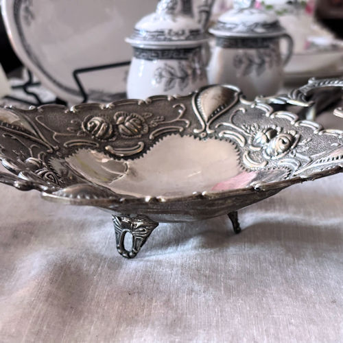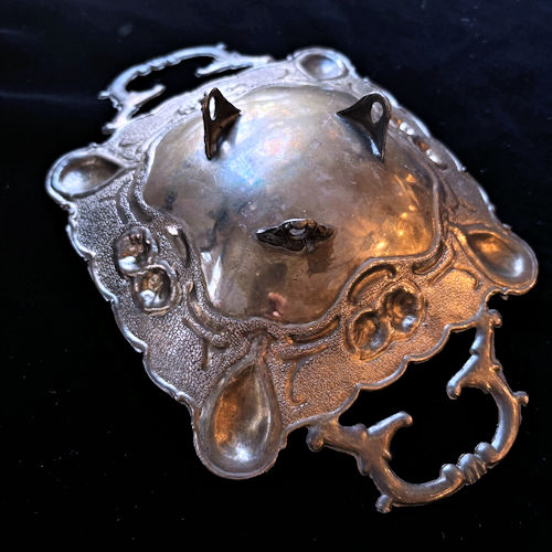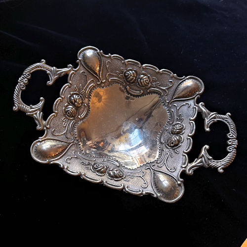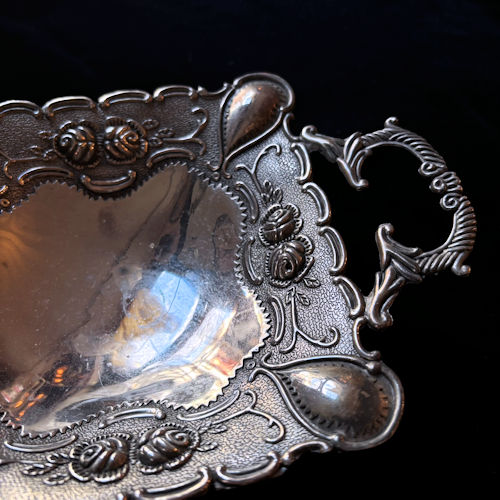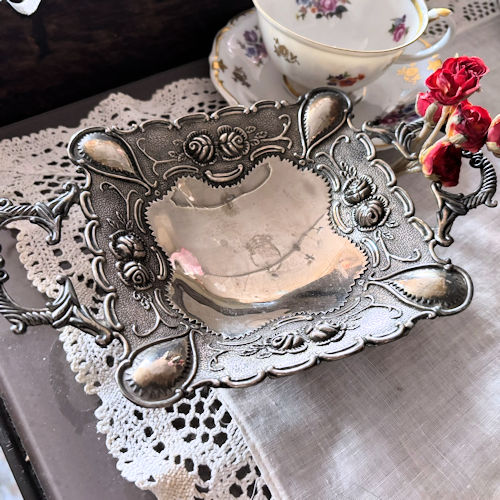 | 薔薇のレリーフが優雅な印象のトレイ。スクエアのフォルムが甘さを引き締めます。もこもこと浮き上がる薔薇と四隅のふくらみがポイント、優雅な曲線デザインのハンドルもアクセントになっています。あまり見ない小さめのサイズ、ボンボンやチョコなどを入れて来客時のおもてなしに、また玄関先の小物入れなどにもお使いいただけます。古色あるアンティークらしい雰囲気のあるトレイです。真ん中辺りにうすいシミが見られます。ドイリーやペーパーナプキンなどを敷いてお使いください。 |
