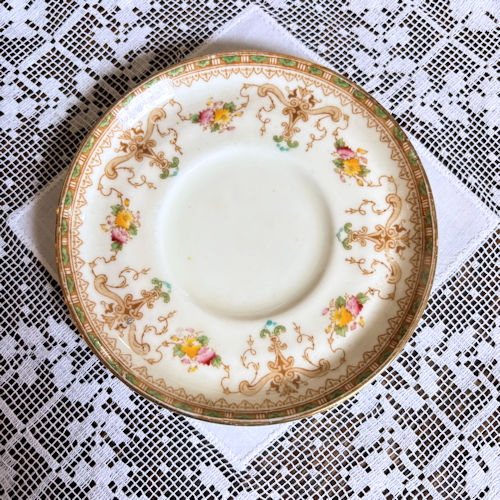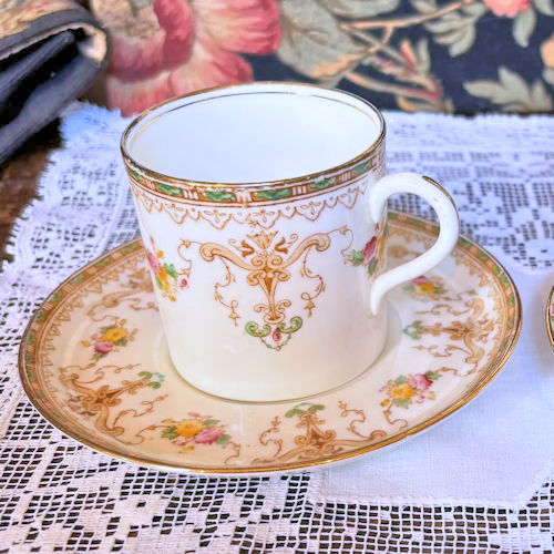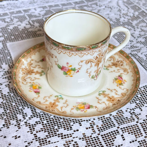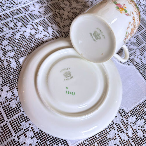 イギリスエインズレイ社製、小さなカップ&ソーサー。ブラウンを基調とした上品な絵柄、赤と黄色の小花が愛らしさをプラスします。グリーンのラインもアクセントととなり、金彩の縁も華やかです。飾っても使っても素敵なお品です。