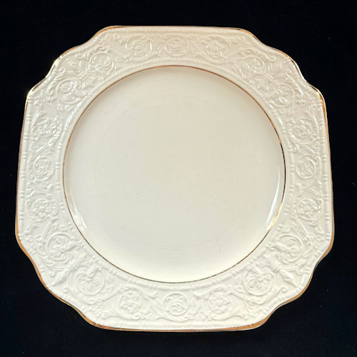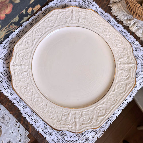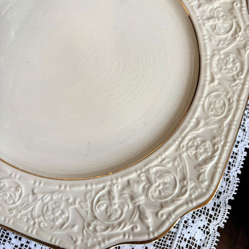 クリーム色の大判プレートです。縁の3、4cmに細かな唐草模様のエンボスが施されています。絵付けはなくエンボスと金の縁だけですが上品で華やかな印象です。盛り付ける料理を引き立ててくれるプレートです。