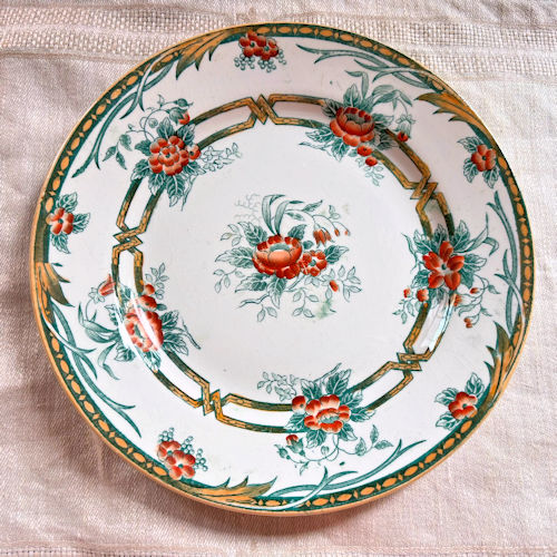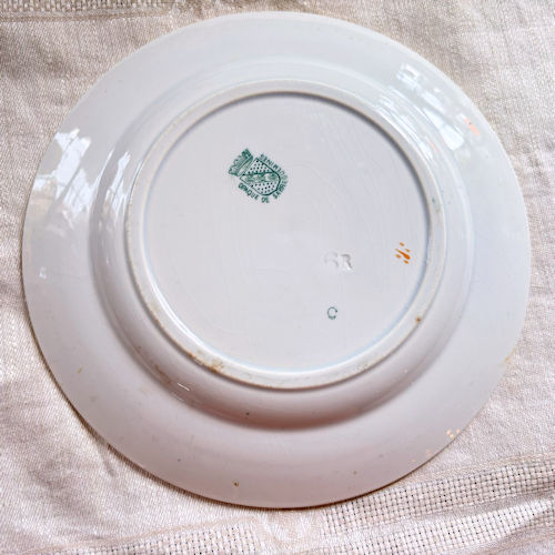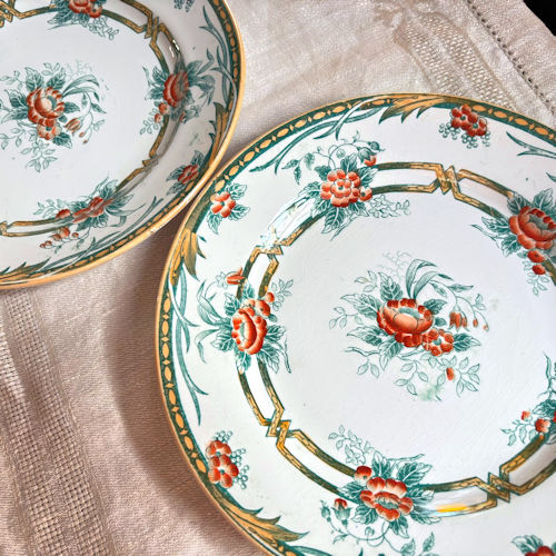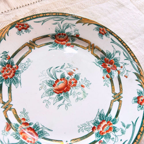 朱赤の花模様とオレンジ色の縁が印象的なプレートです。グリーンのプリントに朱赤とオレンジはハンドペインティングのよう。オレンジの釉薬は少し光沢があるように見えます。小ぶりで使いやすいサイズ、実際の使用はもちろん、絵皿として飾っても素敵です。2枚とも目立つ傷みはございませんが 全体的にカンニュウ、製造時の点々などございます。古いものにご理解ください。フランスサルグミンヌ窯。