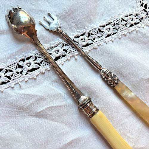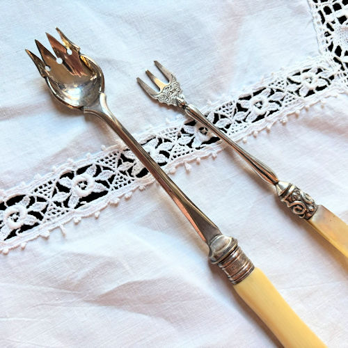 アイボリーカラーのハンドルのカトラリー。長い先割れフォークはイギリス製、象牙のようなハンドルはベークライトでしょうか。先のフォーク部分はシルバープレートのようですが、ジョイントの部分にシルバーの刻印が入っていますので一部シルバーのようです。