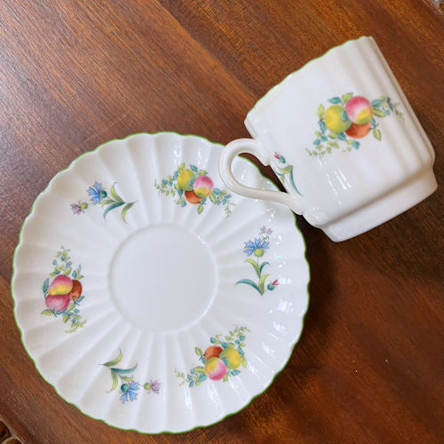 リンゴや洋梨などのフルーツと細かなお花のパターンの可愛いデミタスC&Sです。波打った地模様とグリーンの縁がアクセント。使って飾れるC&Sです。それほど古くなく傷も見当たりませんがヴィンテージ店購入品にご理解ください。