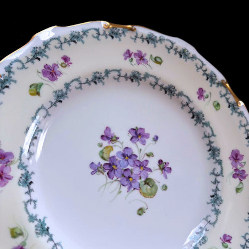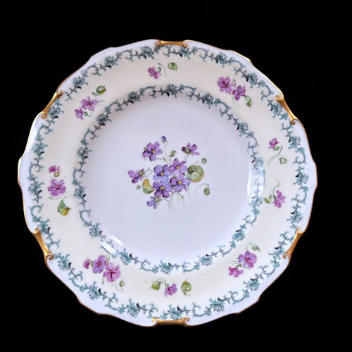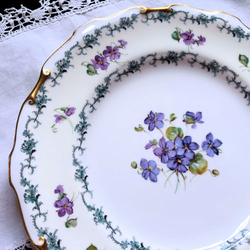 | イギリス、ロイヤルクラウンダービー社のプレート。可憐なスミレが中央などに散りばめられ、ブルーのフラワーリムが縁取ります。縁には金彩も施され華やかな印象です。飾り皿としても、もちろん実用としても楽しんでいただけます。スミレはハンドペインティング、ブルーの花はプリントに手彩色のようです。全6枚ございますが、ハンドペインティングのため1枚1枚少々の違いがございます。目立つ傷みはございませんが古いもの、アンティークショップ購入品にご理解ください。 |