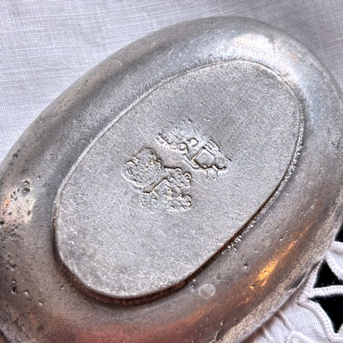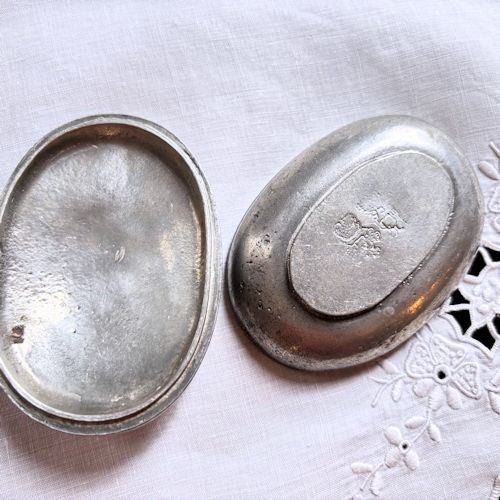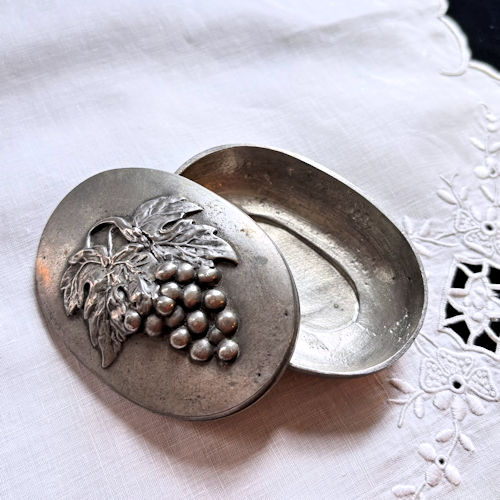 葡萄の浮彫のふたもの。フランスのエタン製です。エタンはフランス語のピューター(錫)、マットな落ち着いた銀色が魅力です。小さいながらどっしりとした重量感がございます。アンティークらしい鄙びた美しさ、あまり多くは入りませんが小さなものを入れて飾っていただけます。全体的なくすみ、小傷などございます。判読不能なホールマークも入っています。本物のアンティークがお好きな方に。