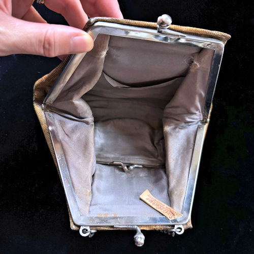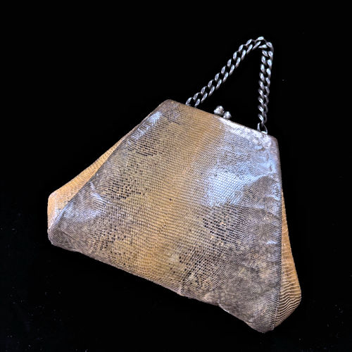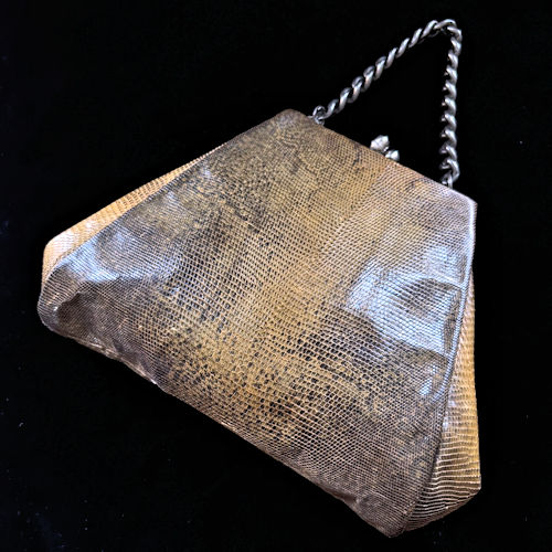 | 細かな斑が美しいリザード(トカゲ)革のハンドバッグです。ナチュラルなベージュとアースカラー、中央が薄く外側に向けてグラデーションに色が濃くなっています。台形のスタイリッシュなデザイン、大人な印象です。パカッと大きく口が開き、内側にがま口ポケットがございます。スレなどはございますが実用にも使っていただけるくらいの状態と思います。外側の革も艶があり、程度は比較的良好です。太くて短いチェーンハンドルも洒落た雰囲気。サブバッグとしてお使いいただくのをおすすめいたします。古いものにご理解ください。 |