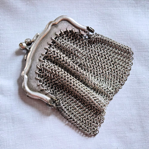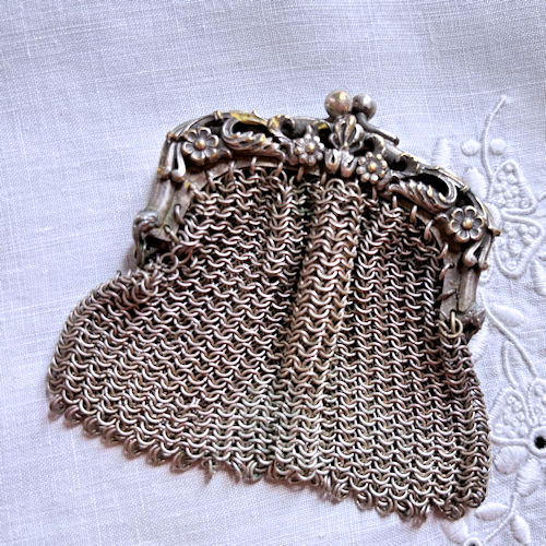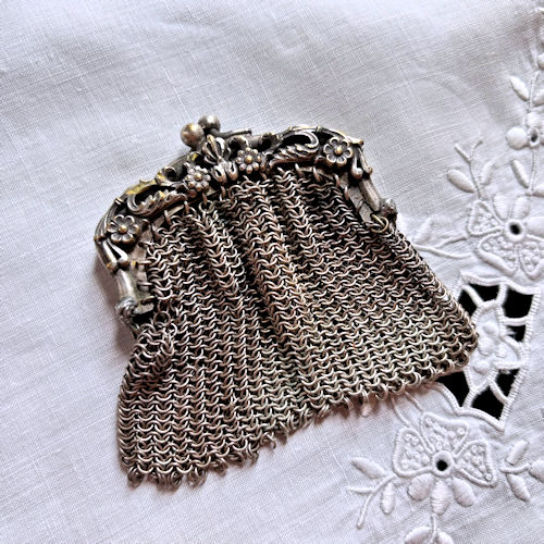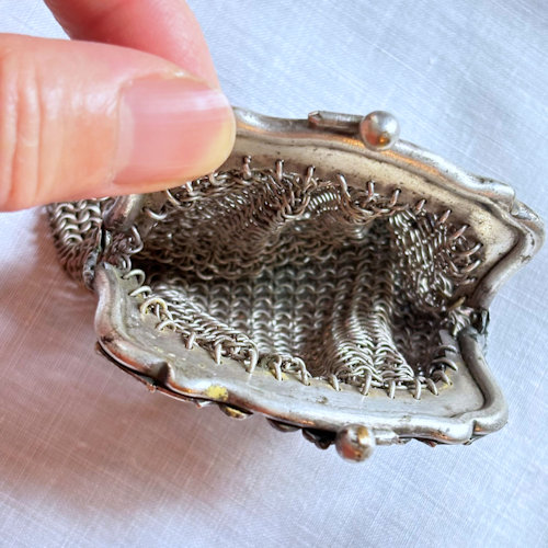 メタルメッシュのがま口ポーチです。とても小さなポーチ、コインが少し入る程度のサイズです。メタルメッシュバッグはアンティークでは定番ですが、メンズライクなシンプルなものが多いように思います。こちらは口にギャザーがよせられ、口にも花などの彫刻があしらわれ愛らしい印象です。金属の経年によるくすみは見られますが大きく目立つ傷みはございません。開閉もスムーズです。古いものにご理解ください。
