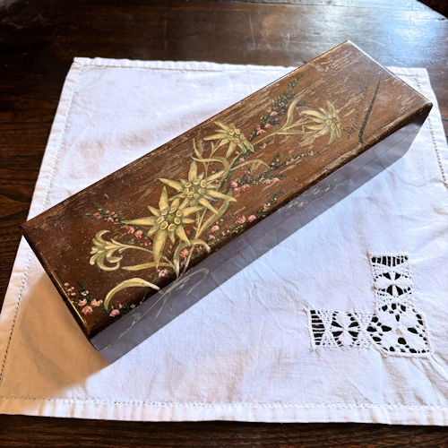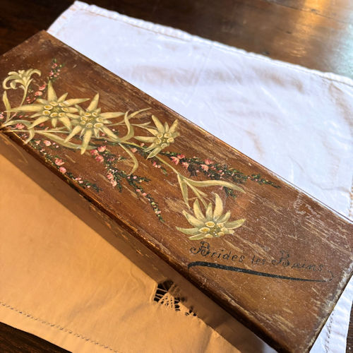 | ハンドペイントで花が描かれた細長いフォルムの木箱です。深い色味の木に薄いグリーンの花とピンクの小花が散りばめられています。グリーンの花はエーデルワイスのよう。端に書かれているのはBrides