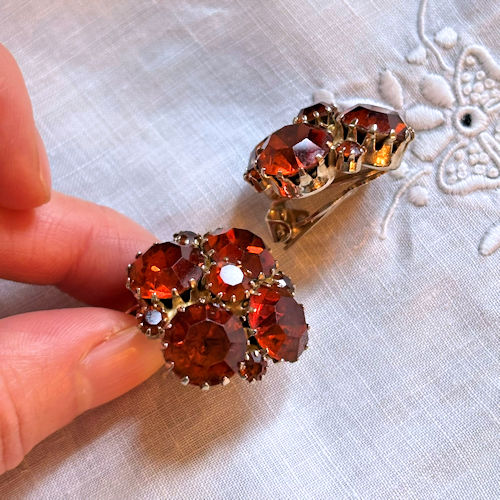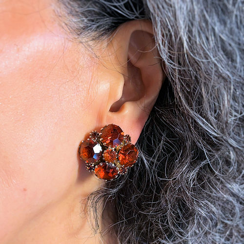 華やかなガラスがキラキラと輝くイヤリングです。オレンジがかったアンバーカラーのガラス、少しくすんだ深い色合いながら輝きは深く華やかです。WEISSというアメリカのコスチュームジュエリーブランドのもの。存在感のあるイヤリングです。よく見るとガラスの中に箔の剥がれと思われる黒い点々が見られますが目立つものではございません。ヴィンテージにご理解ください。