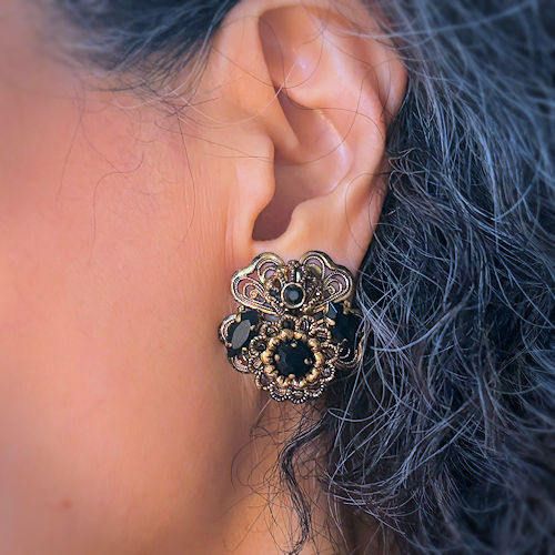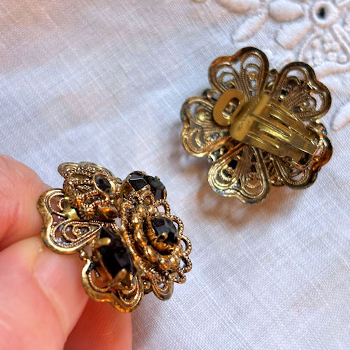金色に黒のガラスが大人っぽい雰囲気のコスチュームイヤリングです。細かなフィリグリー(線細工)のように見えるデザイン、立体感があり手の込んだ作りになっています。大きめで存在感のあるサイズ、遠くからも目を引きます。個性的なおしゃれがお好きな方におすすめいたします。W.GERMANYの刻印、西ドイツ製です。金属に少々のくすみや経年感がございます。ヴィンテージにご理解ください。