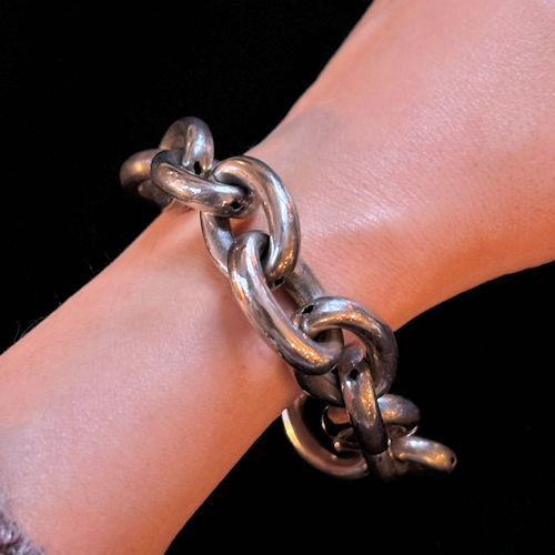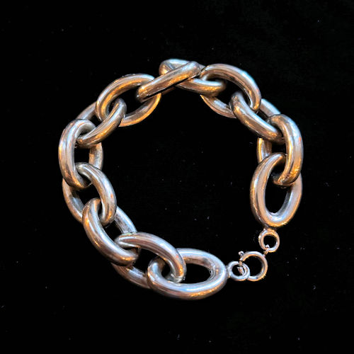 たいへんスタイリッシュな印象のチェーンブレスレットです。とてもボリュームがあり存在感がございます。シルバーと思われます。フランス銀製の刻印のようなものが見えますが摩滅していて判読不能です。経年による黒ずみが燻し銀の風格を見せ、アンティークならではの雰囲気を高めています。性別を問わずつけていただけそうです。