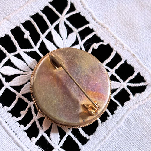3cmほどの中に細かなガラス片がぎっしりと敷き詰められたマイクロモザイクのブローチです。中央には花のモチーフ、オレンジとターコイズブルーが全体を引き締めます。マルチカラーですがくすんだ色味で落ち着いた大人っぽい印象です。 小さくつけやすいサイズではありますが存在感がありますので装いのアクセントになりそうなブローチです。ほんの小さなカケはありますが目立つものではなくアンティークモザイクとしては程度は良好です。古いものにご理解ください。
