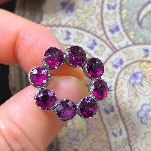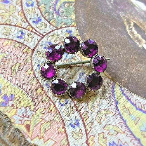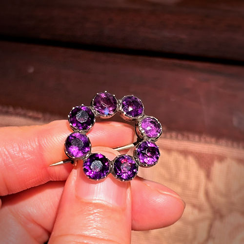 古色あるアンティークでありながら大変美しく輝くアメジストのブローチです。8粒の大粒アメジストがリング状に配されたデザイン、シンプルなデザインですので合わせやすく、サイズ的にも程よいつけやすさいです。照りの良い華やかな紫が光を浴びるとより美しくキラキラと輝きます。小さめながら存在感のあるアクセントになるブローチです。