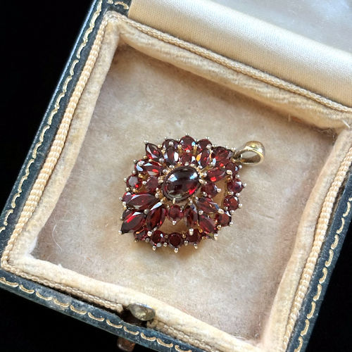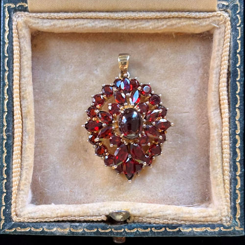 大ぶりで華やかなガーネットのペンダントトップです。赤く深く輝く大粒ガーネットがオーバルの花のように配され、たいへん華やかに輝きます。中央石との間にシードパルが細やかに敷き詰められ上品さを添えます。存在感のあるサイズ、シンプルな服装が華やかな装いに格上げされそうなペンダントです。1920年代製。