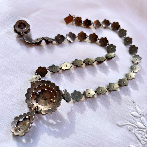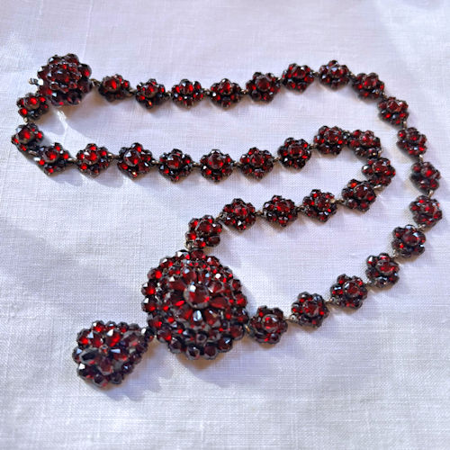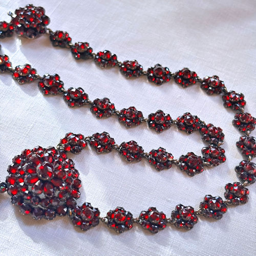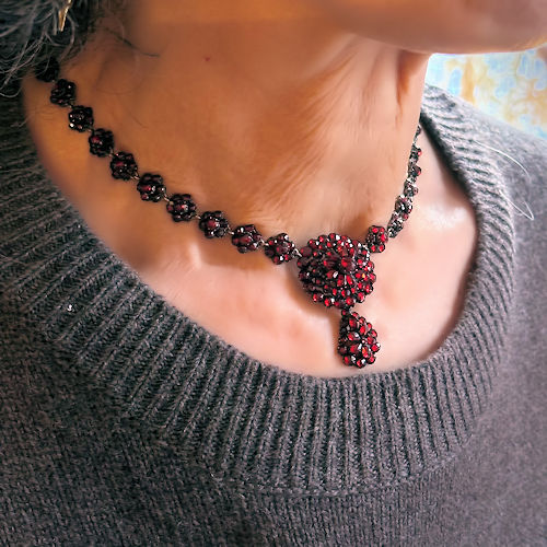 | ガーネットをふんだんに使ったネックレスです。首周りぐるりがすべて花モチーフガーネットになっているたいへん贅沢な作り。トップ部分は立体的に配されたオーバルから下がった雫型モチーフが揺れるデザインになっています。ヴィクトリア時代のガーネットは黒みがかった赤、華やかすぎずたいへんシックで上質感ある輝きです。首に美しく沿う長さ、シンプルなワンピースやトップスと合わせて華やかなお席でもつけていただけそうです。ローカラットゴールド台で裏側がしっかりと留めつけらられています。何世代にも渡って宝物にしていただける、アンティークの真髄とも言える逸品です。 |