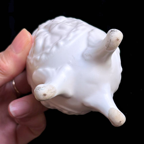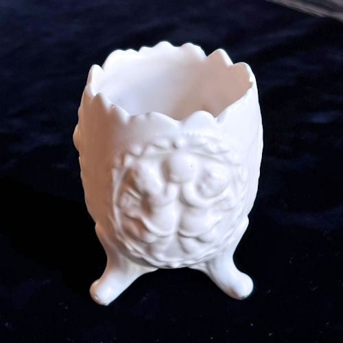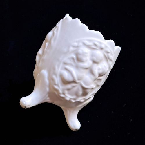 天使のモチーフ、教会で使われていたものでしょうか、足付の陶器です。卵型のボウルに3か所天使のモチーフが浮き上がったデザイン。マットな白磁の中にぼんやり天使が浮き上がる雰囲気の良いお品です。小さいものながら存在感がございます。フランスパリで購入いたしました。傷みなど特に見当たりませんが古いものにご理解ください。