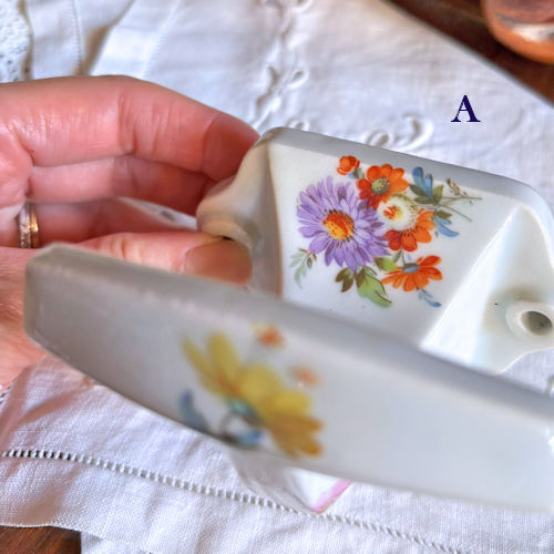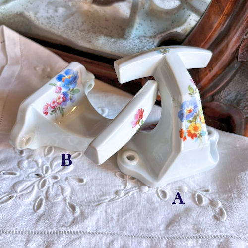 フランスで購入した陶製フックです。白地に様々な色の花々がプリントされています。フックの部分の上下、壁につく部分にも絵柄がございます。それほど古いものではないようですが、クラシカルな雰囲気たっぷりですのでお部屋のインテリアのアクセントになりそうです。目立つ傷みなど見当たりませんがアンティーク店購入の品物であることにご理解ください。