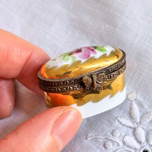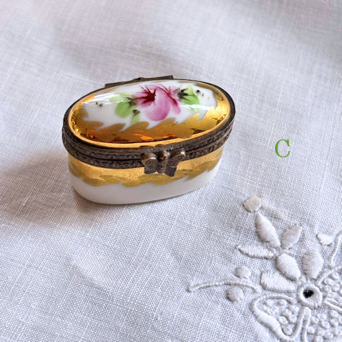 Cはたいへん小さく親指の先ほどの大きさです。ハンドペインティングの薔薇がトップに、側面には金彩が華やかに施されています。