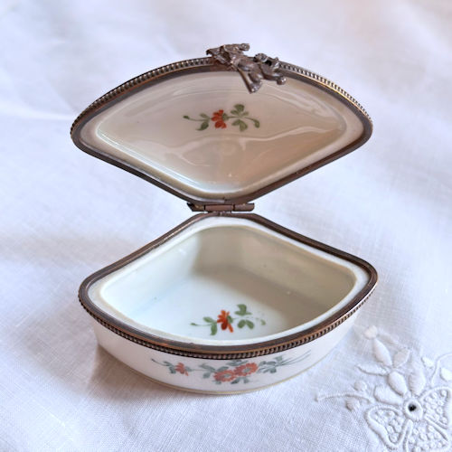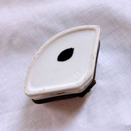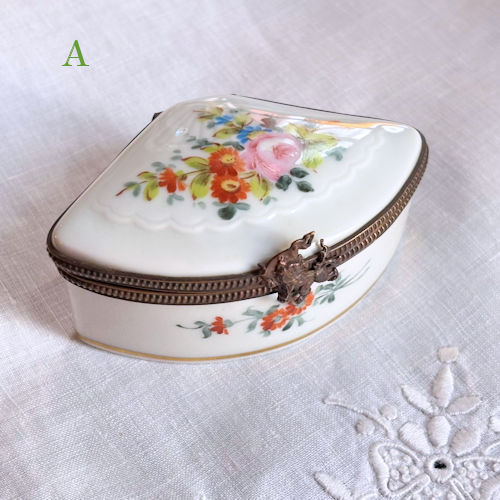 Aは珍しい扇型。ふた上部には扇のエンボスが施され、その上に花が描かれています。側面には表も裏にも愛らしい小花が、内側にも描かれています。口金には獅子のような紋章風モチーフがついています。