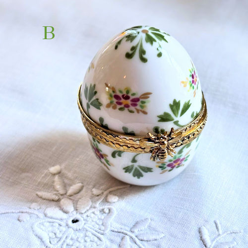 Bはコロンとした愛らしい卵型。グリーンのリーフと赤の小花の模様です。口金には蜂のモチーフがついています。